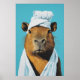 Un retrato encantador y capilar de un capibara, el roedor más grande del mundo, vestido con un atuendo parecido a un spa. El animal está vestido con una toalla blanca y otra envuelta alrededor de su cabeza, sobre un suave fondo azul. La tranquilidad y serenidad del capibara dan la impresión de que está disfrutando de un momento de relajación, añadiendo un toque de humor y calidez a la escena. El lavado de ropa destaca la piel del capibara y la textura suave de las toallas, lo que hace de esta obra una pieza encantadora y alegre.