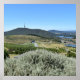 Un panorama panorámico del Arboreto de Canberra presenta un paisaje verde y exuberante bajo un cielo azul claro, con la montaña negra coronada por una torre de comunicación en el fondo. La vegetación, con hileras de árboles y arbustos, se complementa con una visión a lo lejos de las masas de agua.