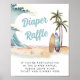 Pequeño cartel de descenso de canchas de canapé con temática de surf, con un paisaje acuático tropical de playa con palmeras, costas arenosas, y vibrantes tablas de surf verde azuladas y marrones y "Diaper Raffle" un divertido guión retro azul.