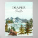 Para la mesa de rifa de Diaper en tu ducha de bebé. Este diseño tiene montañas rústicas de color acuático con un lago reflectante delante y pinos que rodean el lago. Oso adulto con su cachorro delante. Texto de "Diaper Raffle" en la parte superior.