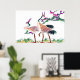 Esta Grulla Rojo Crowned tiene dos grúas bajo un árbol con un fondo blanco cada grúa tiene un pico rosado y plumas naranjas rosadas paradas debajo de la rama del árbol con una flor rosa y un fondo blanco. Esta es una hermosa foto. en este poster