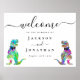The illustration showcases two cheerful dino grooms in vivid, eye-catching colors against a crisp white background, combining fun personality with clean, contemporary style. Perfect for gay weddings, same-sex marriage celebrations, and dinosaur-loving couples, this welcome sign instantly sets a happy and welcoming tone.