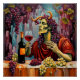 La A.I. creó la interpretación a partir de mi descripción de Dioniso, el antiguo dios griego del vino que se representa sosteniendo un vaso de vino tinto, que parece contemplar su contenido en medio de una abundante propagación de uvas. Vestido con una prenda roja, el personaje se sienta en una mesa sobre un fondo de viñas y follaje cubierto.