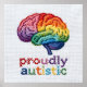 Obra de arte bordada colorida de un cerebro de arco iris con la frase cosida "orgullosamente autista". Este diseño hecho a mano celebra el orgullo del autismo, la neurodiversidad, la conciencia del TDAH y la autoaceptación, al tiempo que promueve la inclusión y el empoderamiento de una manera vibrante y edificante.
