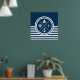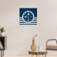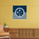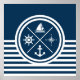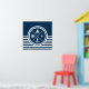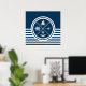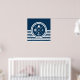 Diseño de temática náutica con símbolos náuticos (ancla, velero, velero, brújula) sobre fondo rayado blanco y azul marino.