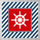 Diseño de temática náutica con decoración de ruedas de vela en cuadrado sobre fondo rayado azul y blanco