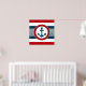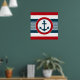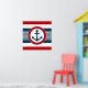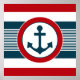 Diseño náutico con decoración de ancla en forma redonda sobre fondo rayado azul, rojo y blanco