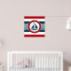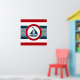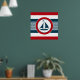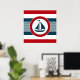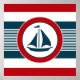 Diseño náutico con decoración de velero en forma redonda sobre fondo rayado azul, rojo y blanco