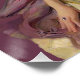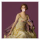 Obra de arte pop de un remix de una pintura vintage de una mujer en amarillo soplando un chicle rosa con fondo de patrón dorado.