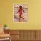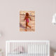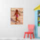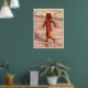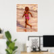 Joven chica con traje de baño rosa que corre a través del surf. Tarde por la tarde El sol se refleja en la arena. Es una historia de diversión de verano.