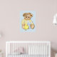 Diseño adorable de cuarto de niño con un osito Teddy lindo que lleva un Tam. Un pollito amarillo bailarín y amigos conejitos de juguete azules están cerca. Fondo a cuadros azul pastel. Sería un dulce añadido a un cuarto de niño.