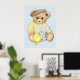 Diseño adorable de guardería con un oso de peluche lindo que lleva un Tam. Un pollito amarillo bailarín y amigos conejitos de juguete azules están cerca. Fondo de cuadros azul pastel. Sería un dulce añadido a una guardería.