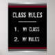 Póster humorístico de "Reglas de Clase" con aspecto de pizarra en plata, rojo y negro. ¡Queda genial con un marco negro!