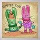 Un lindo conejito rosa y caprichoso ha enterrado al pequeño conejito verde hasta su barbilla mientras juegan en la arena. Diseño original de Christie Black de Creations from the Heart.