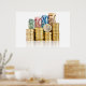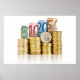 monedas en euros apiladas y billetes laminados, cinco, diez, veinte y cincuenta euros aislados de fondo blanco