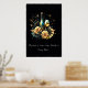Este sofisticado poster muestra una composición encantadora con un fondo negro profundo. En el centro se encuentra una elegante botella de vino con un deslumbrante degradado de turquesa a oro, acompañada de una cristalera llena de vino dorado. El conjunto está adornado con lujosos rosas de color negro y dorado, rodeados de delicadas hojas de oro y elementos decorativos de fibra. Las estrellas doradas y los detalles brillantes crean un ambiente mágico y celestial a lo largo de todo el diseño. Las salpicaduras artísticas de oro y verde azulado agregan movimiento dinámico a la base de la composición. El elegante guión de abajo dice "Elegancia en cada sip. La belleza en cada florecimiento", capturando perfectamente el matrimonio de los posters de la apreciación del vino y la belleza floral. La estética general combina lujo, romance y elementos cósmicos en una impresionante celebración visual.