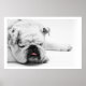 Fotografía de un bulldog blanco durmiendo con la lengua rosada saliendo.