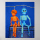 Two colorful calacas or esqueletos sitting on a Mexican wooden box. Celebrate Day of the Dead with this vivid pair of clay skeletons on your wall!