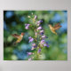 Dos hermosos colibríes en vuelo capturados con flores púrpuras arte en la pared poster.