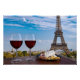 Dos copas de vino tinto con tentempiés con vistas a París y la Torre Eiffel. Vidrio de vino tinto con diferentes tentempiés - plato con jamón, rebanado, queso azul. Pareja, celebración romántica. Cafetería con vistas