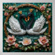 Una detallada obra de arte que presenta dos cisnes que llevan coronas, tocando los picos dentro de un intrincado marco adornado con flores coloridas y elementos de mosaico, simbolizando el amor, el compromiso y la belleza.