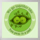 El acurrucado en el interior de una vaina verde son dos guisantes adorables. Cada guisante tiene puntos para los ojos y una sonrisa alegre y descarada. Alrededor de la vina hay viñas y hojas verdes. El diseño está situado dentro de un círculo verde. Alrededor del borde superior e inferior están las palabras "vamos juntos como dos guisantes en una vaina" con letras verdes.