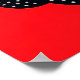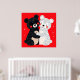 Dos osos de estilo caricaturesco, uno negro y otro blanco, se abrazan. El oso negro tiene orejas redondas y está adornado con patrones punteados, con mejillas sonrosadas que añaden a su expresión adorable. Tiene un parche beige en el vientre. El oso blanco, también cubierto de patrones punteados, tiene una sonrisa alegre y mejillas sonrosadas. El fondo es un rojo vibrante, que contrasta brillantemente con los osos. En general, la ilustración transmite una sensación de calidez y amistad.