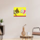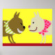 Dos lindos perros con vendas a rayas y con puntas de polka se enfrentan y sonríen. Los colores vivos de este diseño vectorial hacen un gran poster para la habitación de los niños. Amarillo, rosa, rojo y verde.