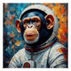 A chimpanzee dressed as an astronaut gazes thoughtfully into space.