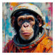 A chimpanzee dressed as an astronaut gazes thoughtfully into space.