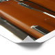 Photograph of a brown drum set showing part of three drums (snare, toms).