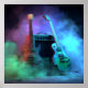 Two vibrant electric guitars - one in earthy tones, another in emerald blue - rest elegantly alongside an amplifier, creating an immersive musical atmosphere. The contrast between the instruments and the dark surroundings evokes passion and creativity, perfect for music lovers seeking visual inspiration.