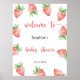 Tarjeta de invitación a la ducha de bebé con ilustracion acuático de fresas. El texto dice "un bebé dulce de berry está en camino". Elementos coincidentes disponibles.