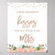 Este cartel de adivina cuantos besos para ducha de novia presenta arreglos de acuarela floral en tonos de melocotón y un texto de caligrafía con textura de rosa dorada falsa.