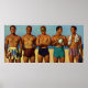 Poster con un vintage ilustracion de hombres en ropa de baño en la playa de los años 50. ¡Retro genial!