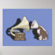Un perro con un cono de rayado aullando a un reproductor de discos de vinilo antiguo con un cuerno de embudo de latón. Color, sombras para un agradable efecto 3-d, en camisetas, posters, tarjetas, regalos.