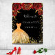 Un poster de bienvenida para una fiesta de 16 y 16 años. Un fondo negro con un polvo falso purpurina de oro, un vestido dorado y rosas rojas, flores. Personalice y agregue un nombre.