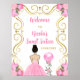 Este dulce cartel de bienvenida consta de un marco dorado elegante, una bella princesa con el pelo castaño y un vestido rosa, flores y un globo. Es perfecto para una dulce fiesta de 16 años.