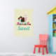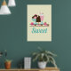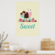 Un poster que dice: Dulce. Con un delicioso tema de helados. Ilustrado con una barra de helado de chocolate, un sundae de 3 cucharas con una cereza sobre la mesa y un flotador de fresa con crema batida. Pequeñas fresas y cerezas a lo largo del fondo. Fondo amarillo pálido. Los refrescantes tratamientos del clima cálido.