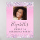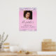 poster de bienvenida de la fiesta de 16 años de bonito y dulce y chica con su foto, purpurina de imitación holográfica brillante, rosa y plateado a lo largo de los límites con un fondo rosado y su nombre en un suave guión de moda gris.