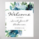 Bienvenido a su boda o fiesta y a la recepción con estos posters bodas. Las flores son flores polvorientas azules.