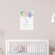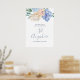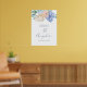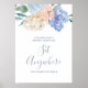Esta polvorienta flor azul se sienta en cualquier lugar poster de señas bodas es perfecto para un boda de primavera o verano. El diseño es elegante y está decorado con peonías azules claras con flores de melocotón y crema en un magnífico ramo.
