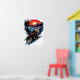 Digital illustration of a red-tailed hawk perched on a blue splattered rock. The hawk has detailed brown and white feathers, yellow talons, and a sharp yellow beak. Behind it, a vibrant sunset with a red-orange sky, silhouetted pine trees, and snow-capped mountains. The background features dynamic brush strokes and splatters, blending realism with abstract art styles. The overall color palette includes rich browns, whites, blues, and reds.