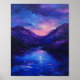 This piece is an impressionistic landscape that captures a mountain valley at the "blue hour," where the last remnants of sunset meet the emerging night sky. The artist uses heavy, impasto-style brushstrokes and likely a palette knife to create a rich physical texture that gives the mountains and water a sense of movement.