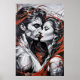Un beso intenso entre dos caras geométricas facetadas —piel fracturada en planos de luz y sombra— mientras cintas carmesí fluyen como sangre, pasión o destino. El marcado contraste entre monocromo y rojo vibrante crea tensión dramática. Una obra de arte poderosa para la moda, el cine, la literatura o marcas de lujo emocionalmente resonantes.
