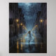 Una escena nocturna digital de ensueño pintada con aceite donde un chica baila alegremente bajo la lluvia en una brillante calle de la ciudad, luces que reflejan el mojado pavimento en una deslumbrante y romántica celebración de la libertad y el amor.