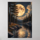 Una gigantesca y radiante luna llena domina el horizonte, arrojando su luz dorada sobre las tranquilas aguas de un lago enmarcado por bosques y montañas. La escena transmite magia, serenidad y el poder atemporal de la naturaleza en perfecta armonía.
