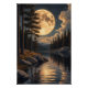 Una luna llena gigante y radiante domina el horizonte, proyectando su luz dorada sobre las aguas tranquilas de un lago enmarcado por bosques y montañas. La escena transmite magia, serenidad y el poder atemporal de la naturaleza en perfecta armonía.