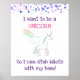 Un poster con un dibujo de unicornio. Una nube esponjosa al final de un arco iris en el fondo. Los tonos rosa y morado de las acuarelas decoran el borde superior. El texto dice: Quiero ser unicornio para poder apuñalar a los idiotas con la cabeza. Gracioso, atrevido y lindo.