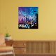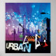 Edificios urbanos con huellas de poster de carreteras cerradas, con edificios de ciudades y rascacielos detrás de una valla y una carretera cerrada con algunas barreras. Detrás de ellos, el cielo está pintado de tonos azules y violetas con rayos.